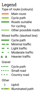 We have used colours as well as lines, solid or dashed, to illustrate the condition of a road for you as a cyclist. A solid line means a cycle path, a dashed line (green or red) means you cycle in mixed traffic. Roads marked with shorter dashes and longer gaps have more traffic but are generally still suitable for cycling.