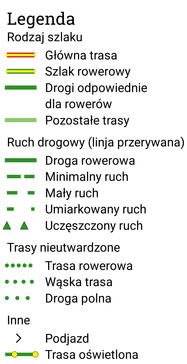 Kolory i linie pokazują charakter trasy: linia ciągła – droga rowerowa, przerywana – ruch ogólny, krótka kreska z odstępem – większy ruch, ale trasa zwykle przejezdna.
